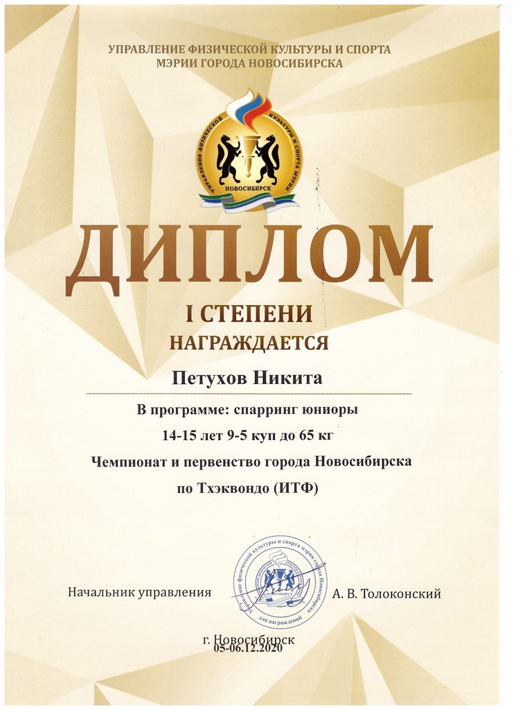 5-6 декабря 2020 г. состоялось Первенство г. Новосибирска по тхэквондо ИТФ, в котором приняли участие воспитанники тренера Васильева Валерия Николаевича: 1 место завоевали Мангиров Артем (3г класс), Жуков Артем (2е), Петухов Никита (8е), 3 место заняла Сагиева Людмила (5е класс). Поздравляем и желаем новых побед в Новом 2021 году!